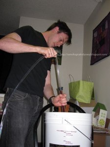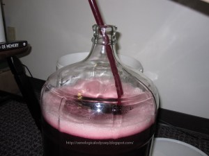 My yeasts had done a brilliant job but they needed one last chance to ferment off any remaining sugars. So after a few forced pumps of the tubes and my wife’s help, the wine frothed into the clear carboy.