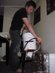 In the evening, after the yeasts had quieted, I set about setting about my secondary fermentation. I emerged from the sulfuric hot spring (i.e.: cleaning my equipment in the bathroom). Once the reek of rotten eggs lifted and my various tubes dried, I arranged the plastic rubber octopus into action.