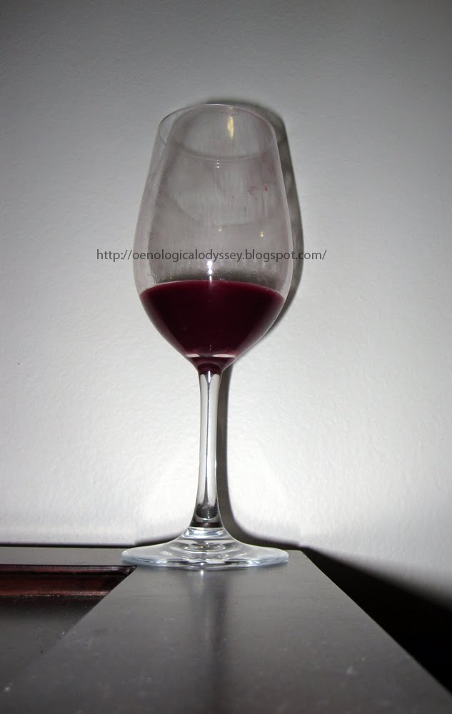 The yeasts had dissolved quite a bit of CO2 into the wine during fermentation. Near the end of pouring, a pink but very manly foam developed from this remaining gas. Another week would let it breath off.