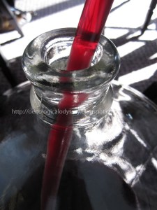 cleansed everything with sulfur, let dry and double checked the specific gravity: 0.997ish…good enough.Once clean and dry, I return the wine to the carboy and begin the stirring. My instructions warn this could take “1 hour to 3 days depending on how much CO2 is present”. Seriously?Luckily the bubbles whisk away after a few hours of intermittent stirring. I immediately switch to my chemical packets before too much oxygen sours the wine.