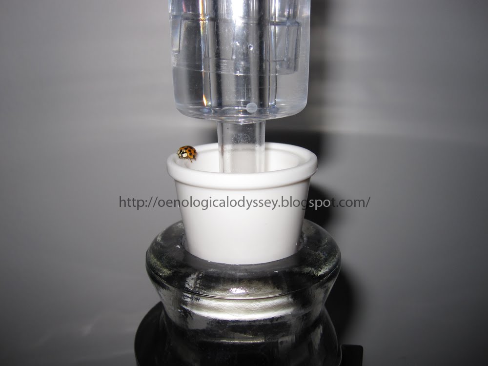 Then I realized: “replace the CO2 with…well…CO2”! I took my handy Private Preserve gas-in-a-can (that I used to keep half-drunken bottles fresh) and gassed my carboy and capped the top with the airlock. The next morning, the ladybug of prophecy signaled my success.