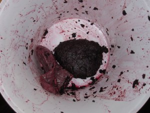 Hands purified (and not trusting my feet), I start the crush. Gravity has already broken a few berries. I could pour boiling water to start extraction, but that would water down the final result. I want a rich dry wine and adding water means adding sugar to keep the potential alcohol high (for each gram of sugar, I will get half a gram of alcohol). If I went down that path too soon, everything would taste like cane sugar not blueberries.