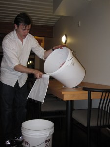 Plan B: Filter press them apart. Trying not stain the new (borrowed) apartment red, I slow pour into a filter bag. Once full, I squeeze the bag, dump the dry skins back in the crush bucket and pour it back into the bag.