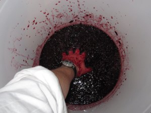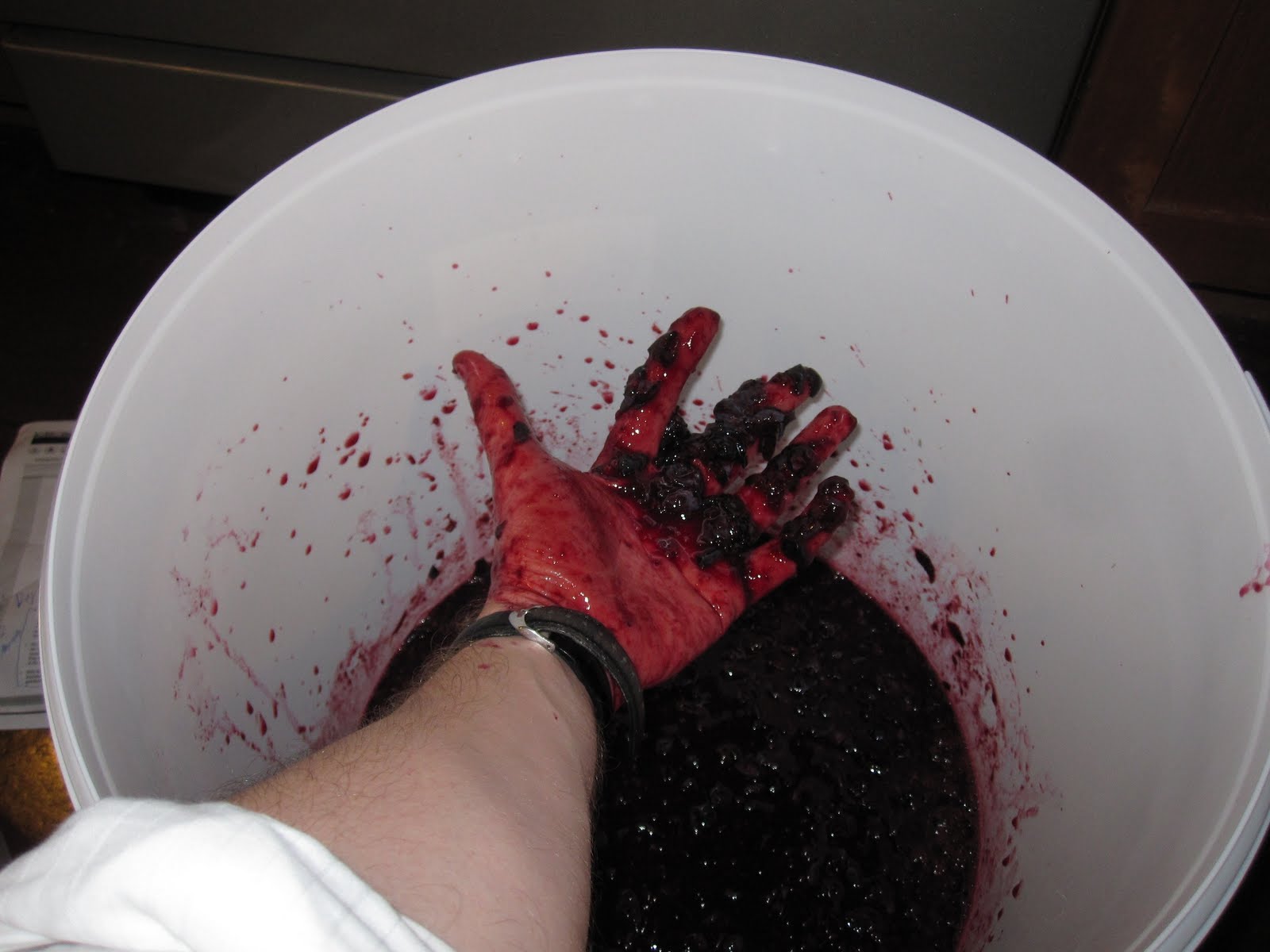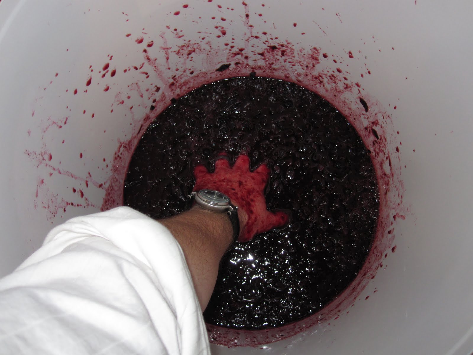 Now any reasonable/rich winemaker would have a machine crusher/destemmer do all the work for them. Even body weight on feet or ancient plank presses would be more efficient than this. But how would I be sure that every berry met its fate? Hand crushing. I get more juice with natural sugars and flavors closer to the source. Yet after an hour of smashing, I’m spent. This really, really sucks.