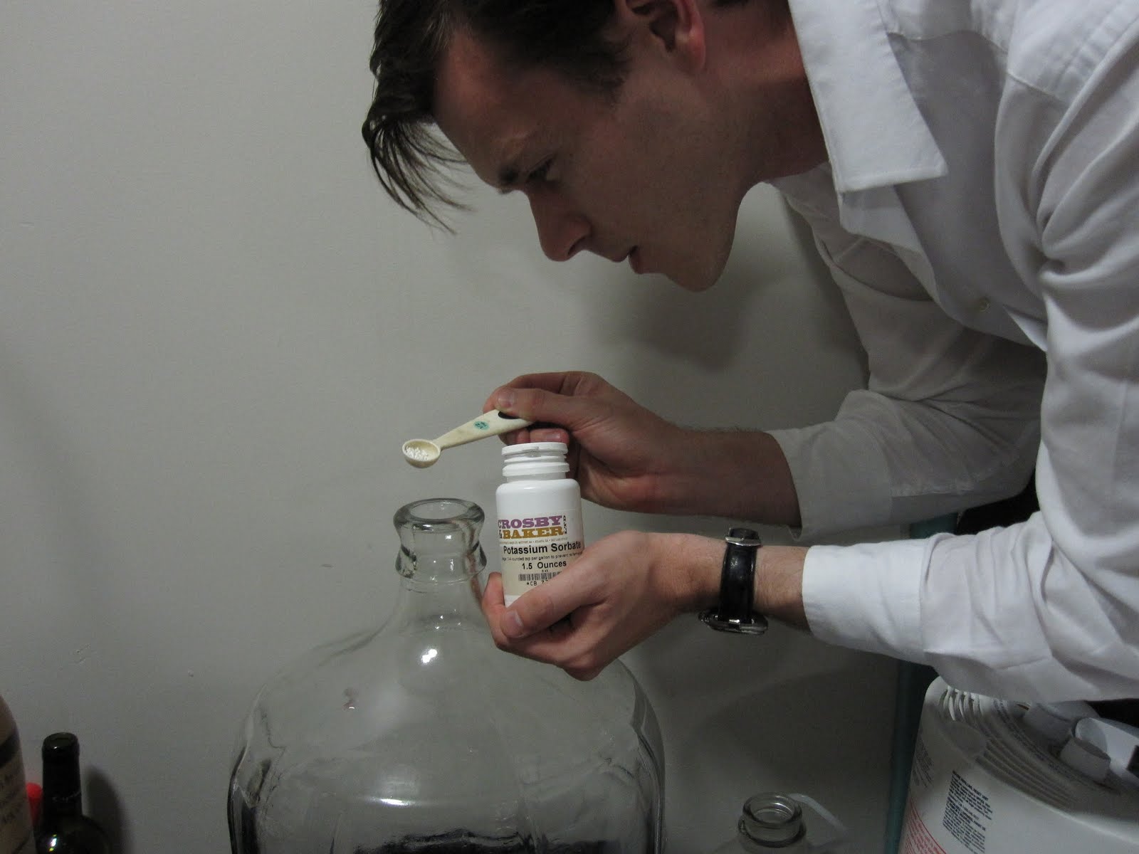 The next step requires stabilizing the must. The yeasts need to stay dead, or I will have another riot of Pompeii-amphitheatric proportions. So I turn to chemical warfare.