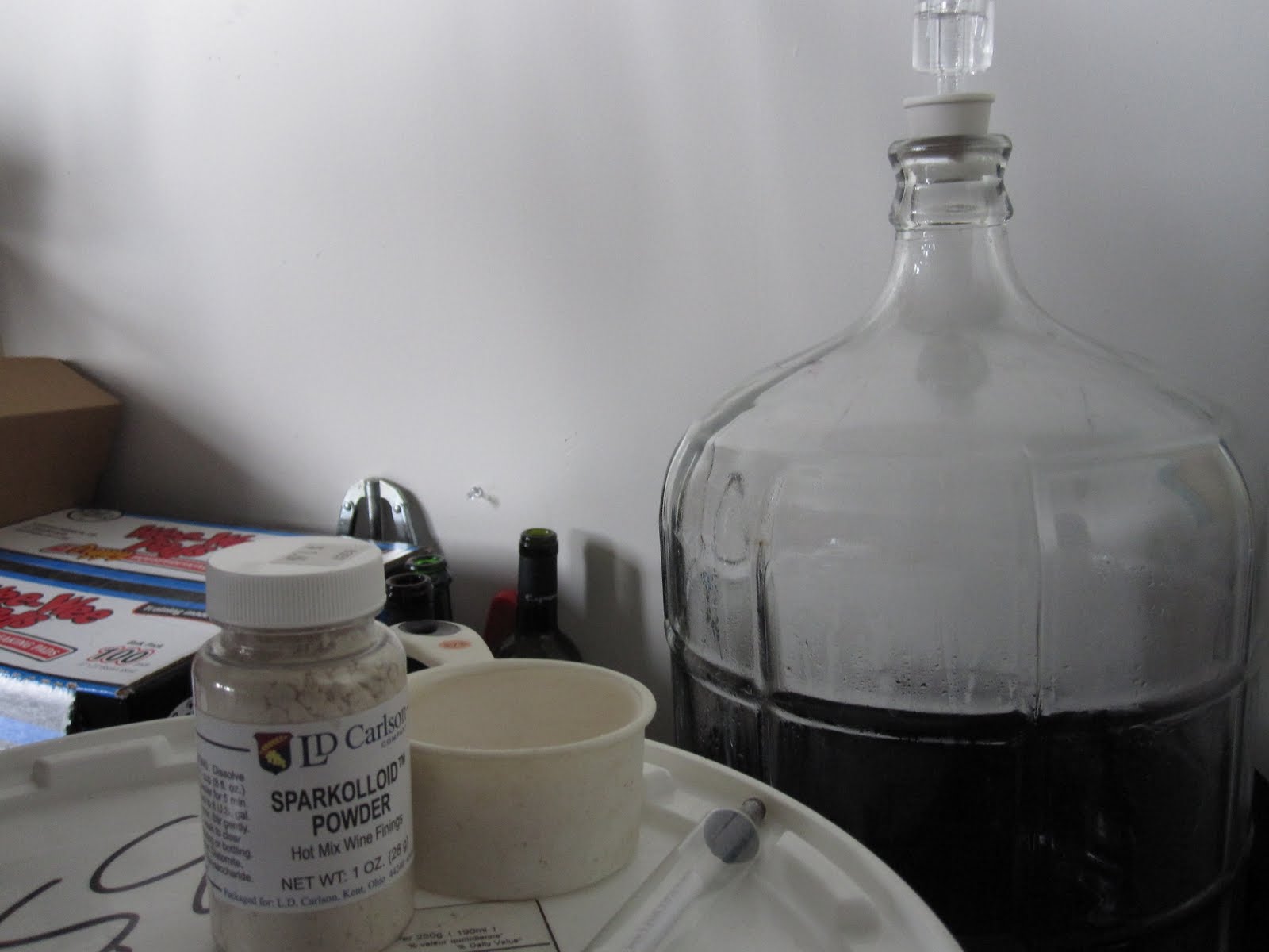 This whole fining process would not be necessary with more time and wine. But with too much airspace, hot summer days and my impatience, I needed to speed it up. So I stir in the Sparkolloid, re-spray the must, airlock it and wait.
