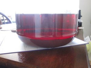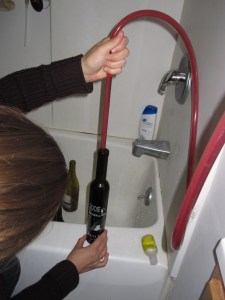 Once everything is sterile (including myself), I try racking the wine into bottles alone. I fail. So, I grab my spouse from dinner preparation.I will pump. She will take on the tube’s end, which, annoyingly, will not fill unless pressed at the right angle, under pressure, into the bottle. The siphon trigger cannot work unless against a flat surface, and most bottle punts (bottoms) curve.
