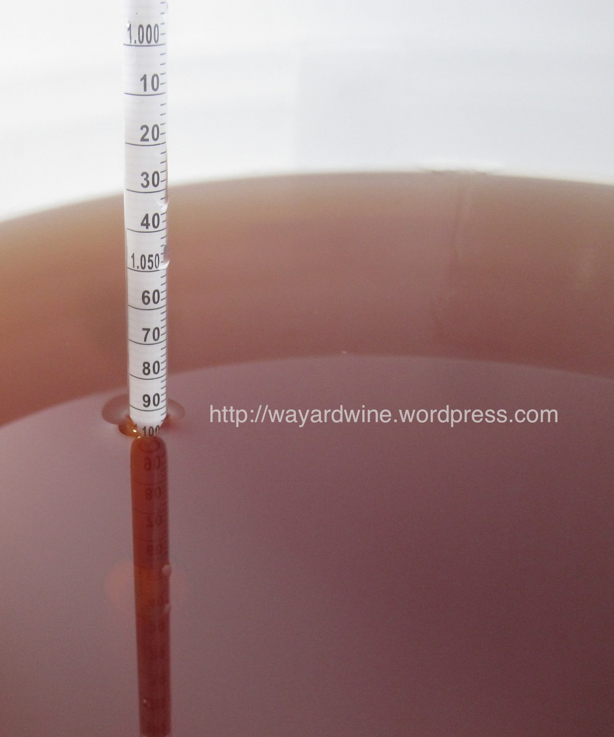 First, I need to level the playing field. The temperature I am working at is around 64F, which will effect my readings. Additionally, my wine kit tools are cheap. But they are the only standard I have. So, I drop in glass plumb bob hydrometer and pray it is close Fall Bright’s.