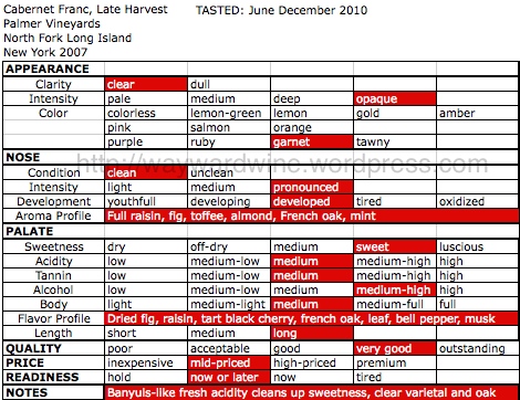 With this in mind, I open Palmer Vineyards’ 2007 Late Harvest Cabernet Franc.