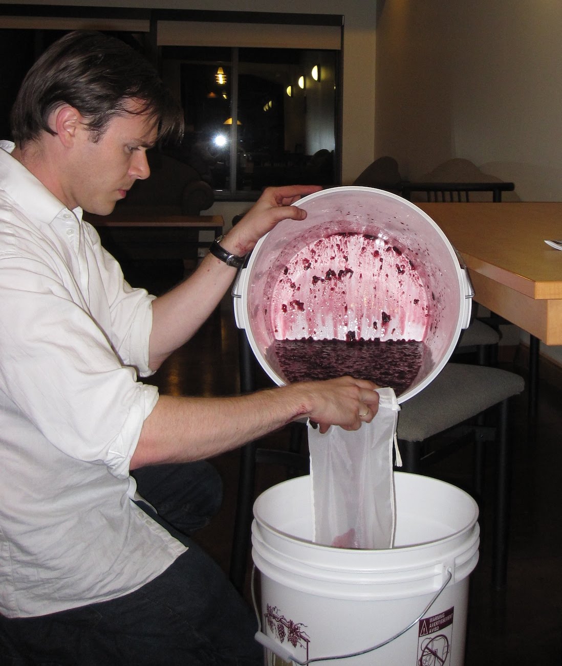 Most red wines spend one to two weeks with pumps or manual punch downs circulating the skins. That extracts more color, sugar, and flavor esters. Exhausted, impatient and lacking pumps or siphons, I just bagged the skins as if they were tea.