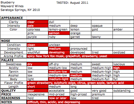 Sure my goal was to make a dry red, but I expected some fruit to hang around. All I can tease out is green strawberry, apple, citrus, sulfur and some spice. My chart below can’t hide my disappointment: