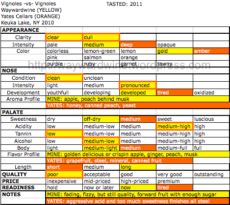The chart below reveals many similarities in the orange-lined-yellow boxes. Both wines start clear but develop floating particulates by bottle’s end. Both noses are highly intense and clean of major faults: very vignoles. The medium-high acids reveal their cool climate origins. Tannins are low and the sweetness keeps the alcohol moderately low. The quality verdict for both is poor.