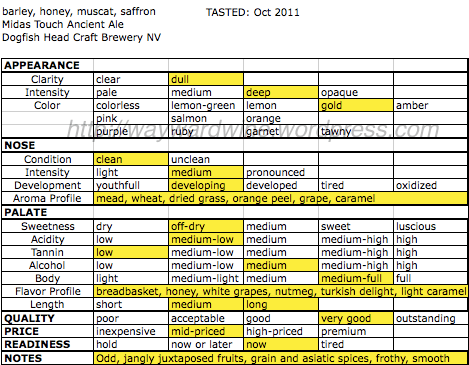 So Dogfish Head, overwhelmed by this sweet honey, grape, beer Frankenstein that they had created, added saffron. That spice cut through the muscat and mead wonderfully. It tastes beer-like and delicious (see my review chart below). And, lucky them, saffron is “the most expensive spice in the world”…well…it is today (it was readily available in antiquity).
