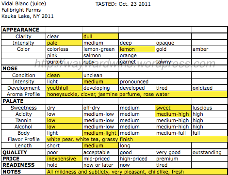 Viva la difference. Compared to 2010’s vignoles, this vidal is mild in many ways: just as its grapes tasted this morning. My chart breaks down its basics: Although a bit demure, this juice wafts up perfumed aromatics, fresh fruits, and dancing acidity (3.1 pH, .78 TA = zing!).