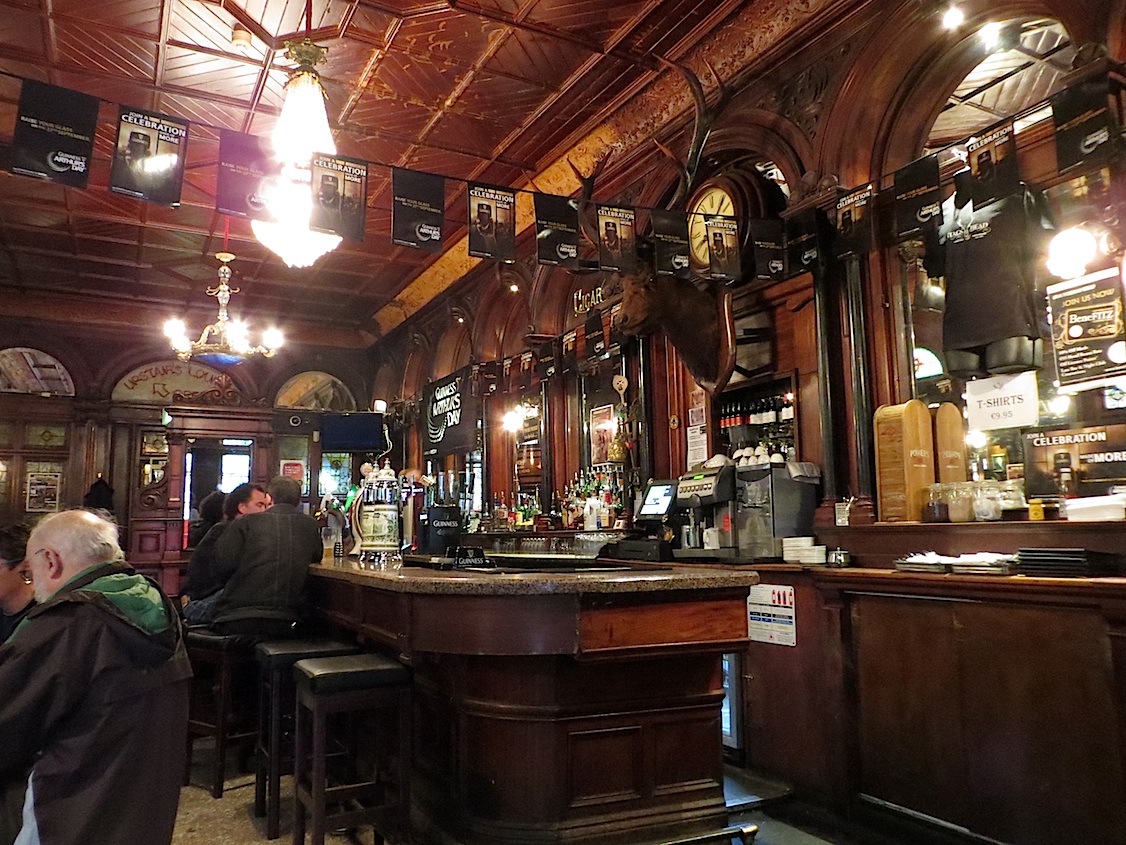 Its location between St Stephens Green and Trinity College on Dawson Street draws locals and tourists alike.  Bottles wallpaper the tight interiors.  No inch lacks alcohol or customers.