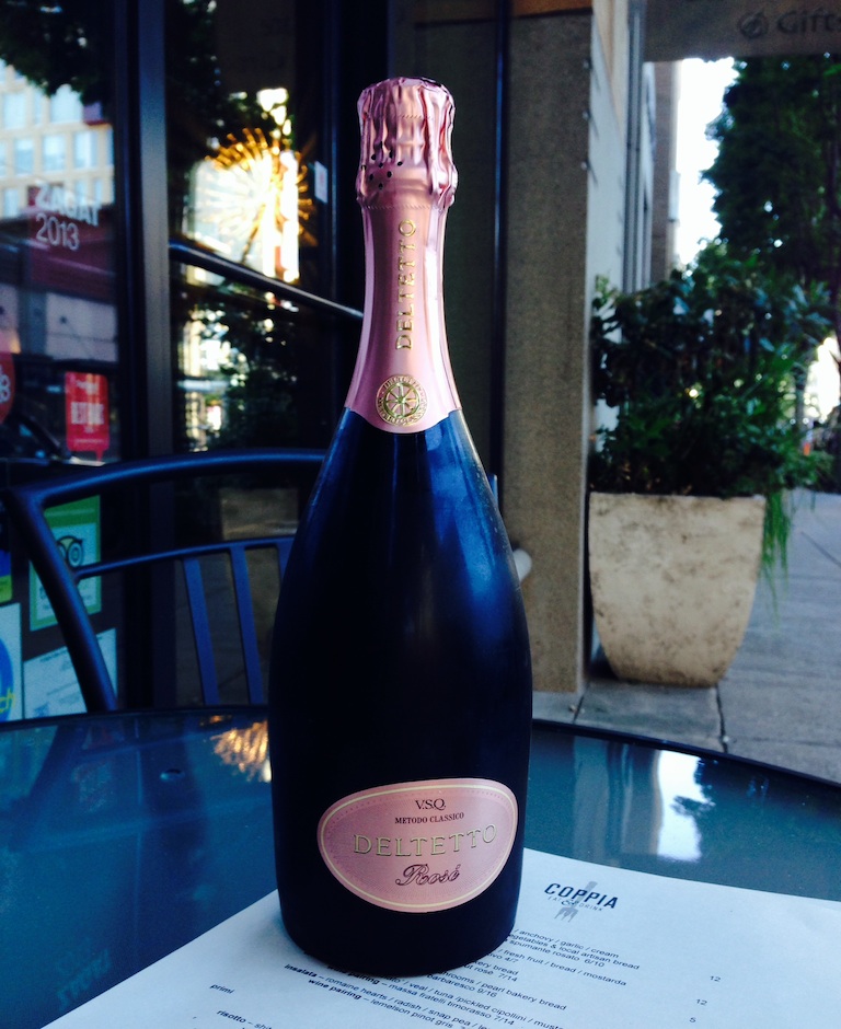 Sweaty thermometers still read 93 F. My palate begs for icy, dry bubbly. Wil suggests something off the list: Deltetto, Rosé Brut, Metodo Classico, Italy: