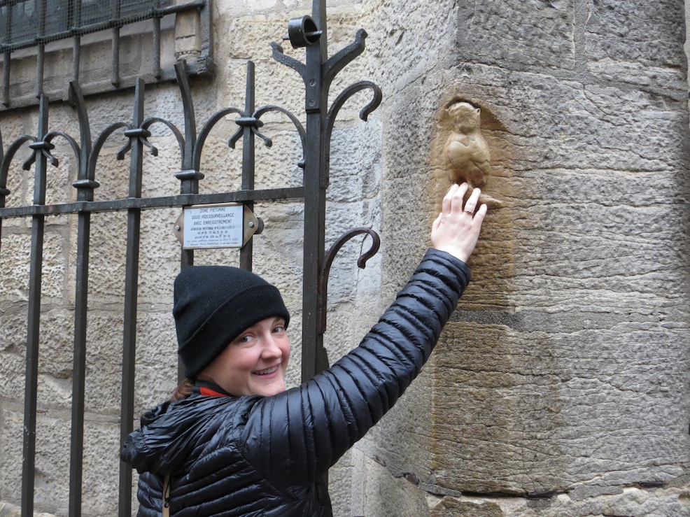 We swim back to Dijon through the rain. After a disappointing but mildly familiar lunch at “My Wok”, we pick up fabulous pastries. Tracy (somewhat inappropriately) touches Dijon’s owl (for luck) at Notre Dame: