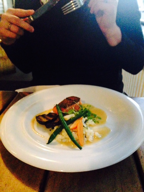 Then out come two glasses of Crèmant de Bourgogne: Burgundy’s affordable answer to Champagne. From Clotilde Davenne, it tastes snappy, citric, a touch saline, and utterly refreshing. This leads us to a challenge: she wants the five course, totally unknown chef’s menu, and I want the Red Wine-Braised Freekeh & Delicata Squash salad, as well as the Merguez-Stuffed Lamb Shoulder.