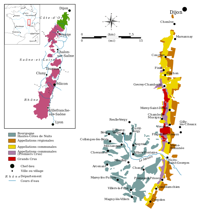 This Thirsty Thursday we look to a small wedge in Burgundy. 4 wee hectares (just 9.9 acres) of Pinot Noir to be exact. Called la Prieuré, it sits on the Western edge of the Hauts-Côtes de Nuits (that blue splotch on the map) near Arcenant.