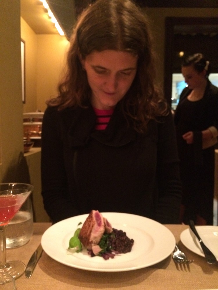 A Cabernet infused Fois Gras medallion sneaks its way onto a peppery arugula salad. The main course Poisson breast and leg tastes stellar.
