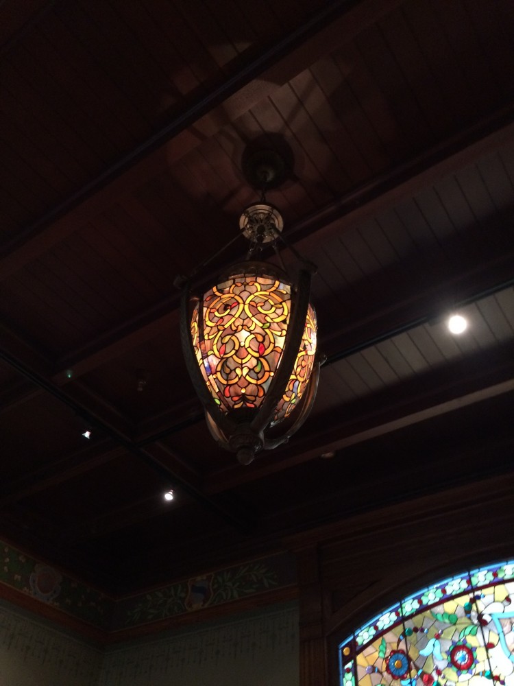 The Rhine House cost Freddy B a cool $28,000 to build. The cool thing is, it is not a museum. We can walk right in. On the left, tea rooms with original tiled fireplaces, dark woodwork, and stained glass provide a gift shop. On the right, a dining parlor has become a tasting room.