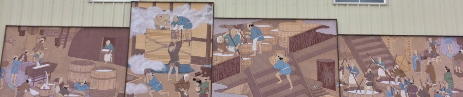 Our tour starts outside with a mural of classic saké production by a local artist.