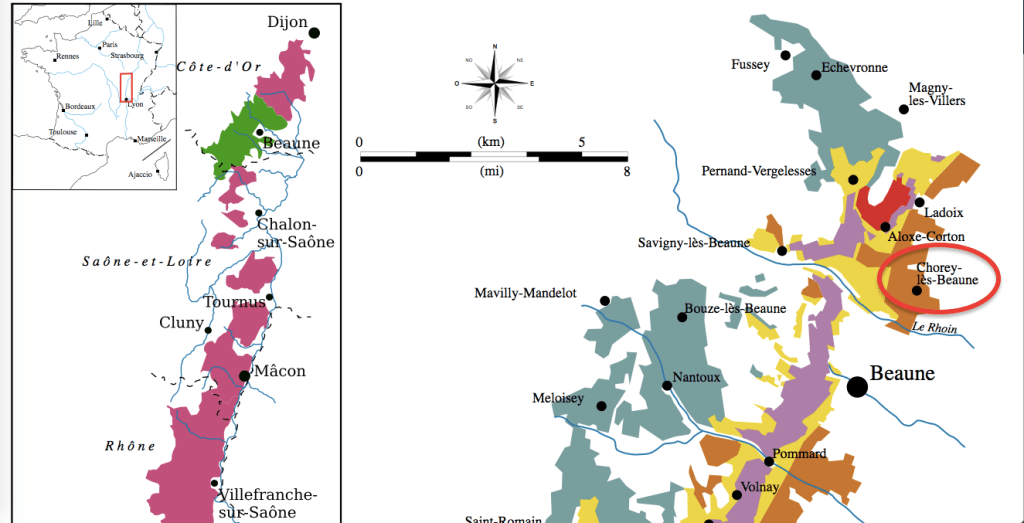 Chorey-lès-Beaune’s 336 acres are mostly Pinot Noir on plains beneath the shadow of the massive Grand Cru hill of Corton (red) and above the city of Beaune.